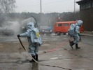 Zu Beginn wurden die Teilnehmer vom Ausbilder Joachim Maigut in den Aufbau und Funktionen der Chemikalienschutzanzüge (CSA) sowie in die wichtigsten Einsatzgrundsätze eingewiesen. Im Anschluss daran folgte eine Eingewöhnungsübung um ein Gefühl für das Arbeiten im CSA zu vermitteln. Dabei wurde auch der Ausfall des Atemschutzgerätes simuliert. Für kurze Zeit mussten die CSA-Träger allein mit der Luft aus dem luftdichten Anzug atmen, denn das sofortige Öffnen des Anzuges wäre im Ernstfall mit einer Kontamination des Geräteträgers verbunden.