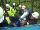Der Übungsablauf - zu Beginn kam wie in Echt ein Fax aus dem Alarmdrucker - konzentrierte sich zunächst auf die Brandbekämpfung, ein Trupp unter umluftunabhängigem Atemschutz löschte den Pkw mit Schaum aus dem Hochdruckfeuerlöscher ab. Parallel dazu wurde der Pkw mit der Seilwinde des Rüstwagens gesichert - denn auch kleine Bewegungen des Pkws könnten das Fahrzeug mehrere Meter in die Tiefe rutschen lassen. Da kein adäquater Zugang zum Fahrzeug (z. B. über die Türe) möglich war, musste das Dach entfernt werden. Anschließend konnte der Dummy möglichst achsengerecht (damit Verletzungen an der Wirbelsäule nicht verschlimmert werden) mittels Schaufeltrage aus der Zwangslage befreit werden.