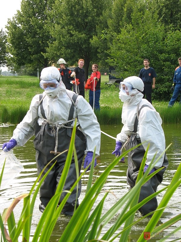 Ölspur (Wasser) wird mit Ölbindemittel (Sägespäne) abgebunden
